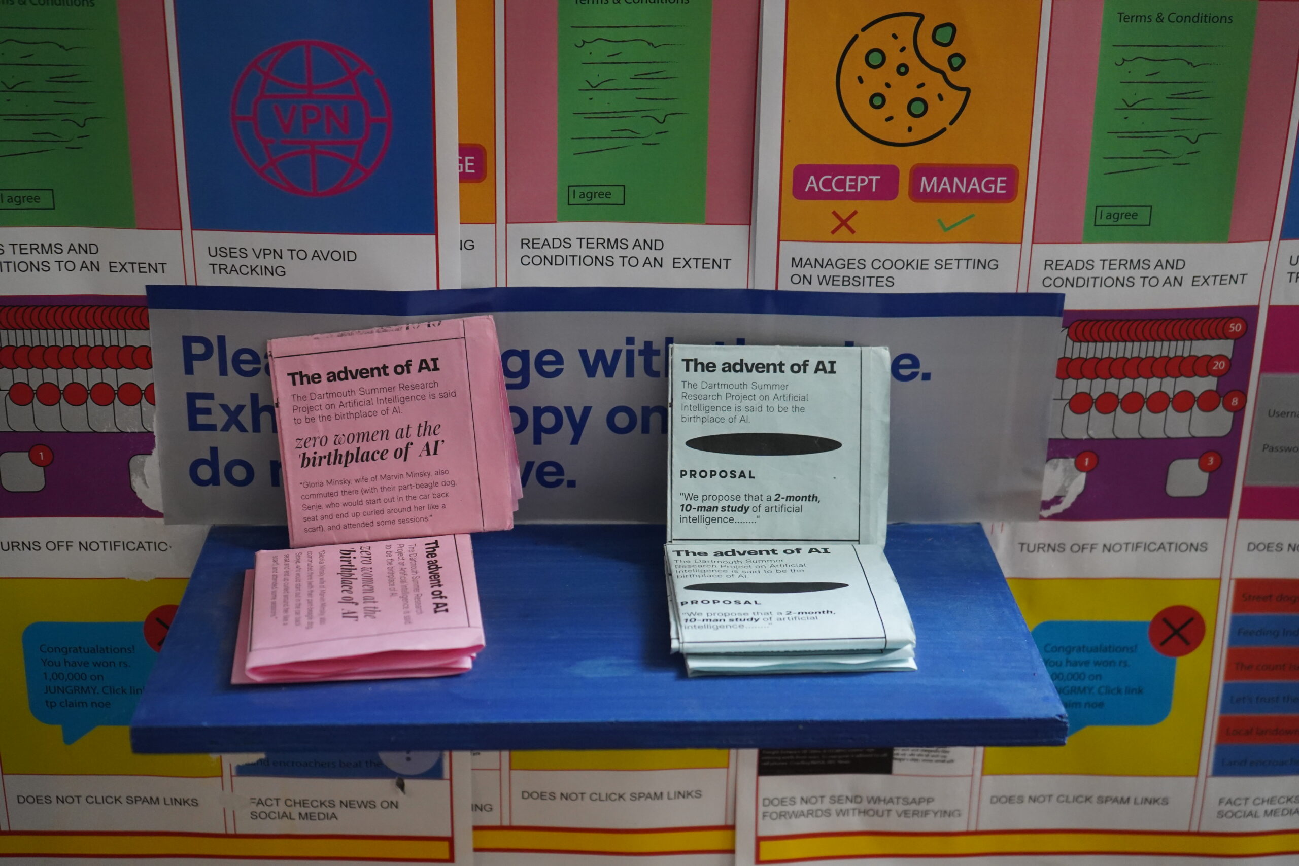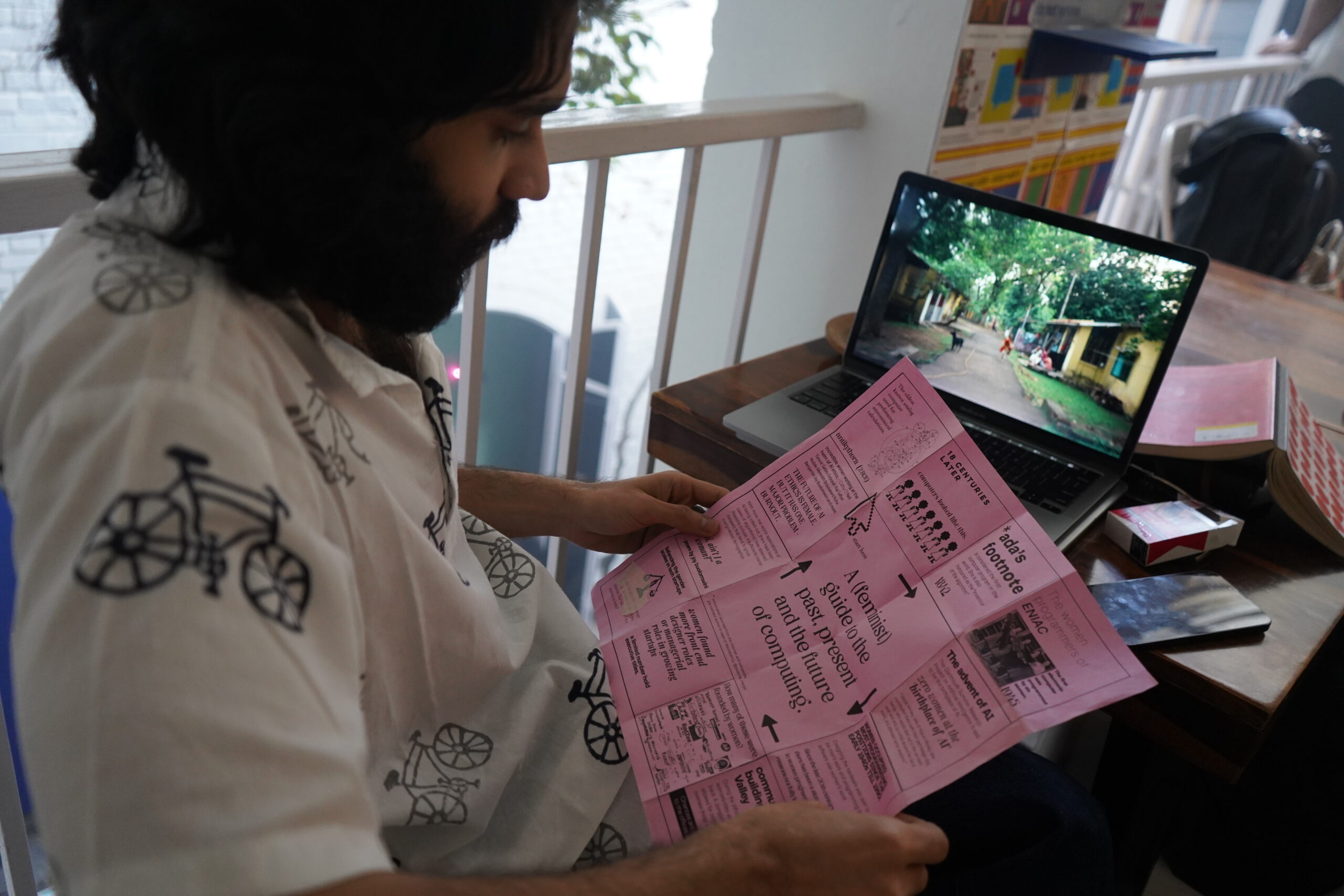 The need for a feminist guide can only be made visible by the existence of another story: the one we all hear often. During the artist’s research into the history of the internet and the advent of AI, she realized that all the literature came from a limited and prominent demographic. Marginalized voices found very little space or were left as footnotes. To shift the dominant narrative and reveal lesser-known stories, she designed the feminist zine, as a conversation-starter for the challenges facing the landscape of technology today.